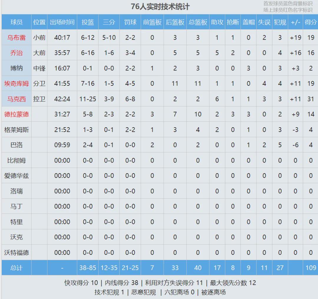 班凯罗有不少外线空位机会,但他不太敢出手,上半场三分2中0。过去两场比赛,班凯罗三分合计9中1。次节两队31战平,半场打完,76人59-55依然领先4分。马克西16分5助、乌布雷和乔治各得11分,埃奇库姆8中3拿到6分5板。